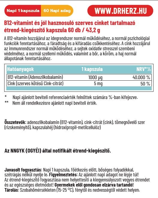 Összetevők: adenozilkobalamin (B12-vitamin), cink-citrát (cink), tömegnövelő szer (rizskeményítő), kapszulahéj (hidroxipropil-metilcellulóz)