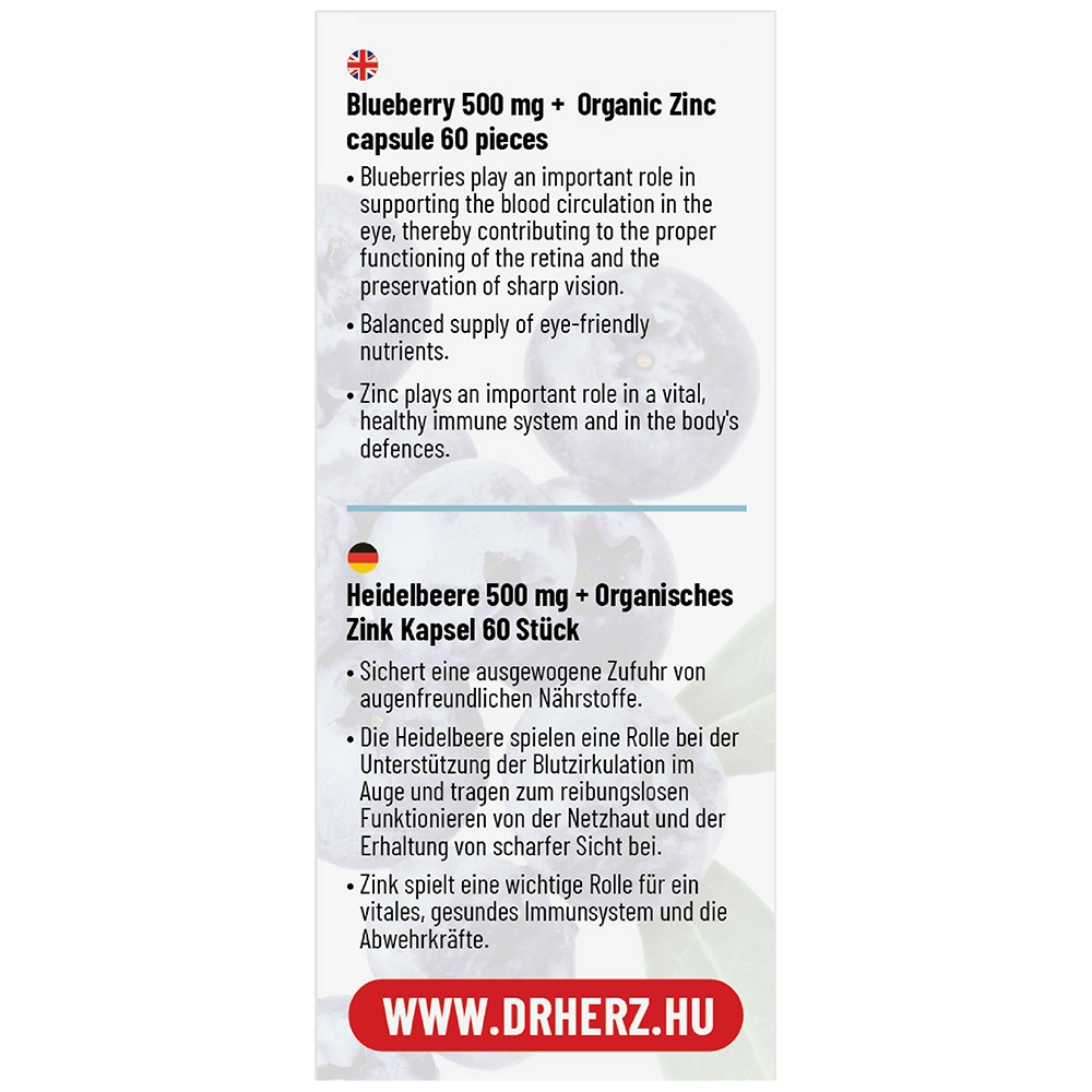 Összetevők: Fekete áfonya (Vaccinium myrtillus) kivonat, cink (cink-citrát),tömegnövelő szer (kukoricakeményítő), csomósodást gátló anyag (mikrokristályos cellulóz), kapszulahéj hidroxipropil-metil-cellulóz