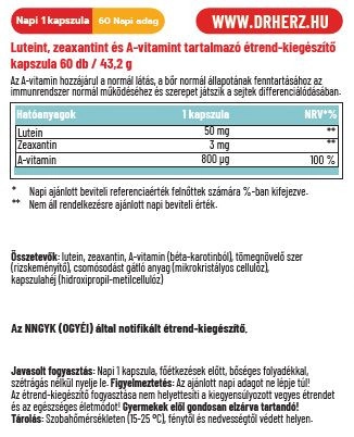 A Dr.Herz Lutein 50mg MAX kapszula magában foglalja a luteint, zeaxantint és A-vitamint, amelyek kulcsfontosságú tápanyagok a szem védelme és optimális működése szempontjából.